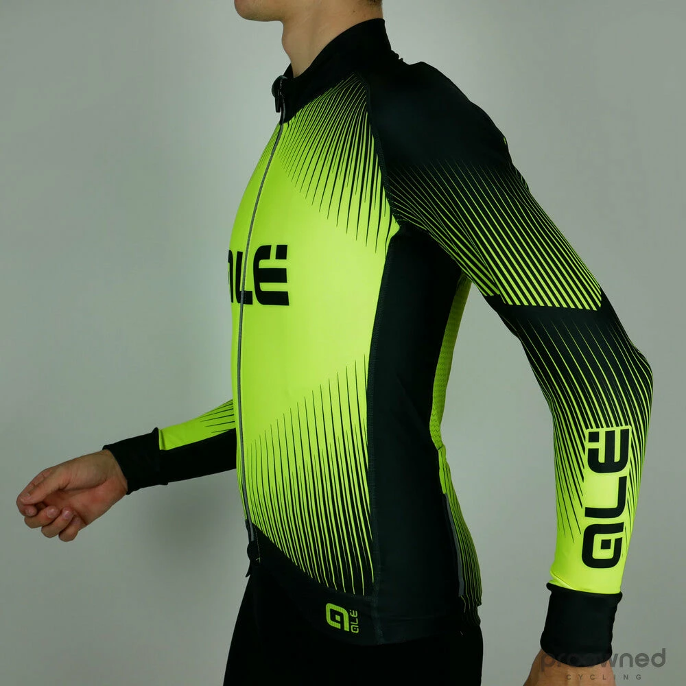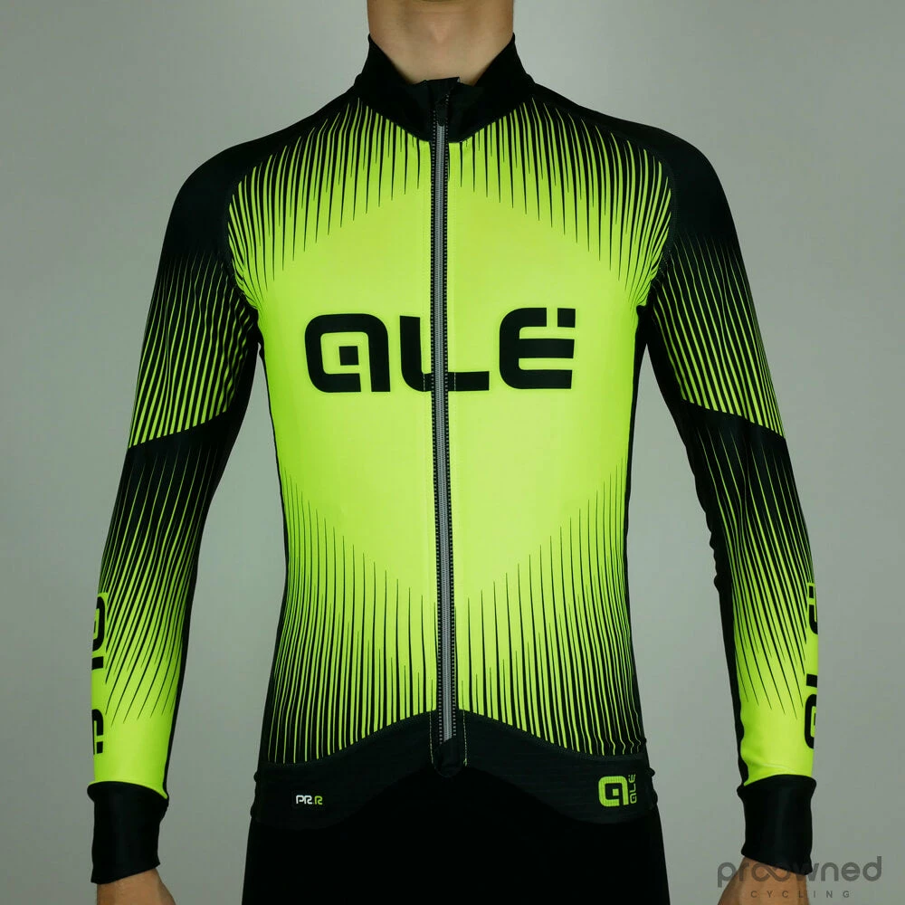 Brand new Alé PR.R long sleeve jersey. Designed for both training and racing, the PRR series from Alé will give you only the best. All clothing in the PRR line is made from the best garment and technology. The front of the PRR jersey features a micro-perforated fabric which is very quick drying and ensures excellent ventilation, this will keep you comfortable and fresh as you hit the climbs. Meanwhile, the back of the jersey uses Rip Pro Air, a woven fabric where thinner areas of yarn create venting zones, speeding up both breathability and drying. As a result, you’ll not only feel cool on the ups, the quick-drying times prevent discomfort and wind chill on those fast and fun downhills. Carbon Wave adds the finishing touch, ensuring bacteria can’t build up and guaranteeing freshness and no odors.