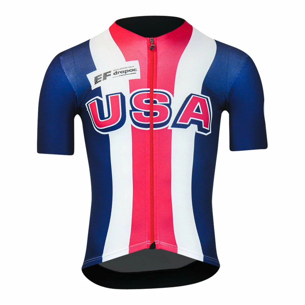 This special Team USA Cycling short sleeve jersey features a Team EF Education logo on the right side of the chest.
