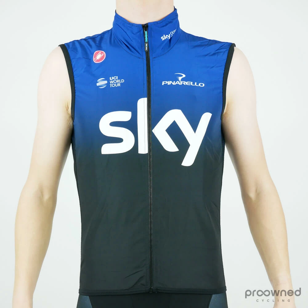 Castelli Pro Light Wind vest from Team Sky* made for the 2019 season. The Castelli Pro Light Wind Vest is perfect for a touch of extra protection on a descent or for a cool morning start. Weighing only 81 grams it’s easily packed away once you’ve warmed up or reached the warm valley floor.