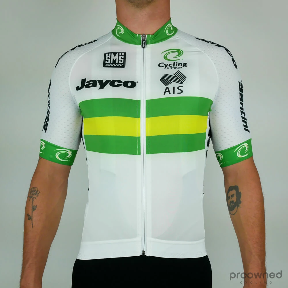 Brand new aero jersey from Santini. This aero jersey comes directly from the Australian National Team and is made for the 2014 season. The jersey is tight and aerodynamic.
