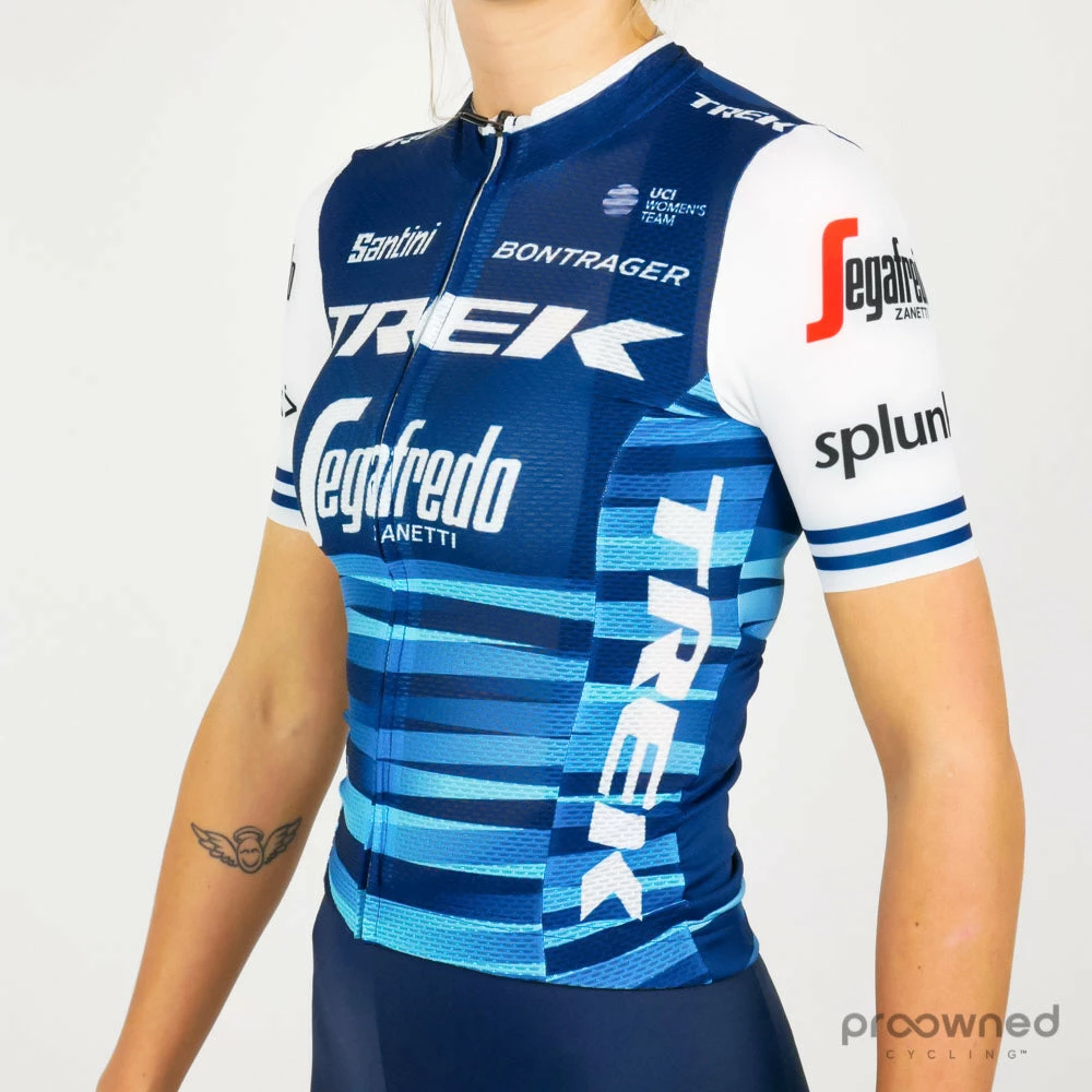 Brand new short sleeve jersey from Santini. This jersey comes directly from the Trek-Segafredo Women world tour team and is made for the 2019 season. The jersey is tight and aerodynamic. The jersey is made of extra thin fabric for hot summer days where ventilation and best perspiration.