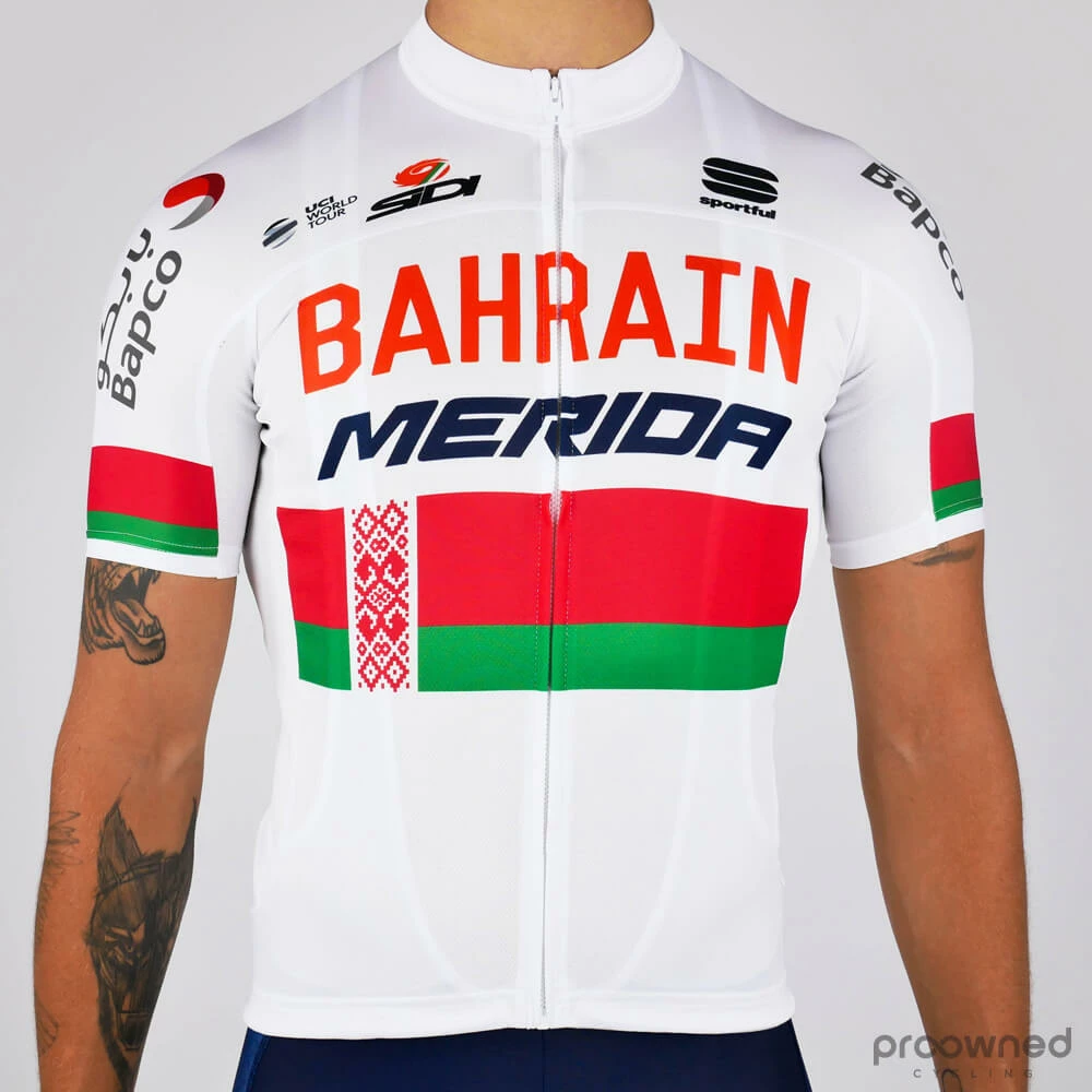 Brand new short-sleeved race jersey from Sportful used by the World Tour team Bahrain Merida* in 2017. The jersey is comfortable to wear and highly breathable. In addition, it has specially designed sleeves with tight cuffs and a stretchable fabric around the waist. These two features ensure that the jersey is kept in-place. Also, the jersey is made in a tight fit to provide maximum aerodynamic gain for the rider. Finally, the jersey has three back pockets for easy storage of your riding essentials.